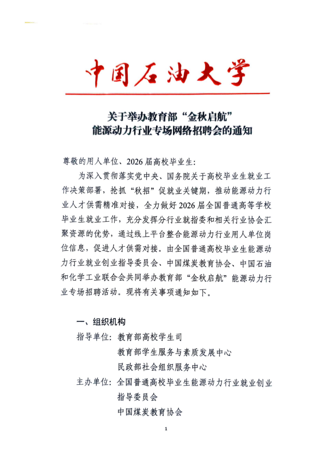 关于举办教育部“金秋启航”能源动力行业专场招聘活动的通知