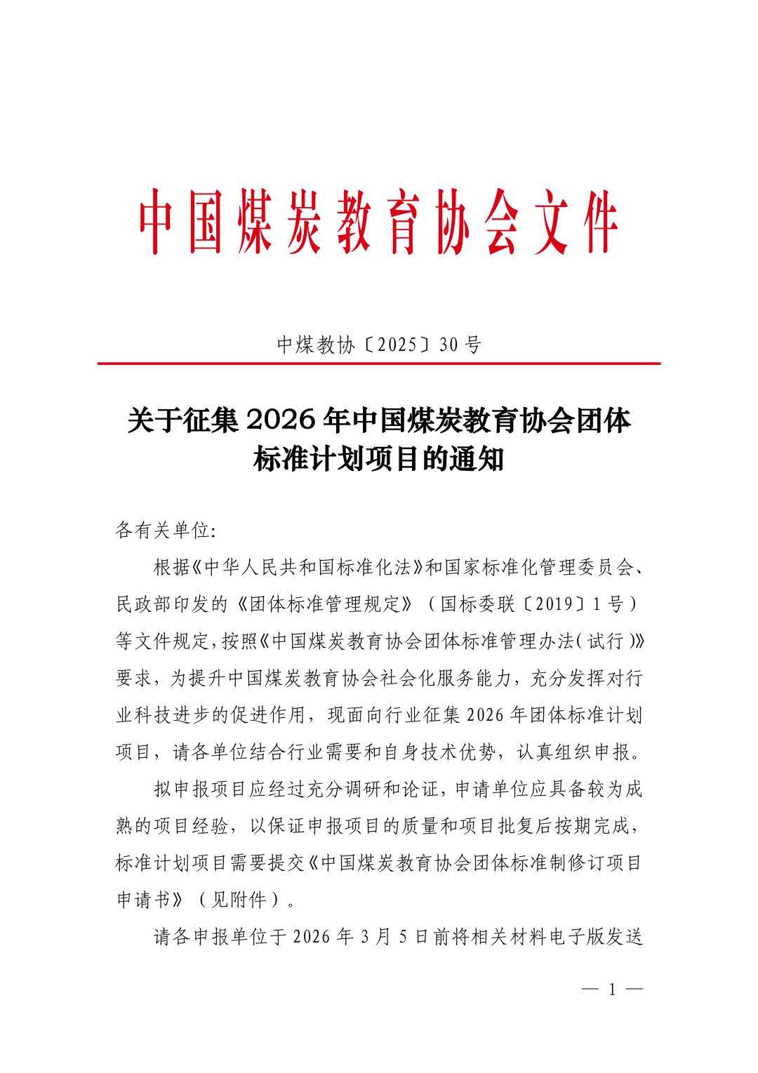 关于征集2026年中国煤炭教育协会团体标准计划项目的通知