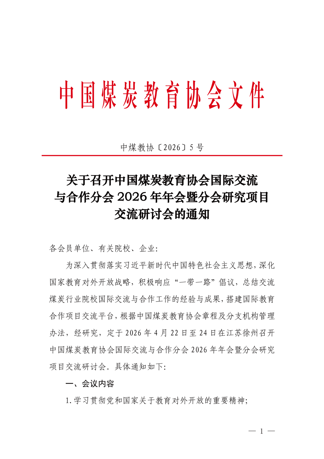 关于召开中国煤炭教育协会国际交流与合作分会2026年年会暨分会研究项目交流研讨会的通知